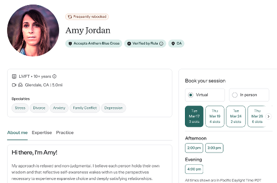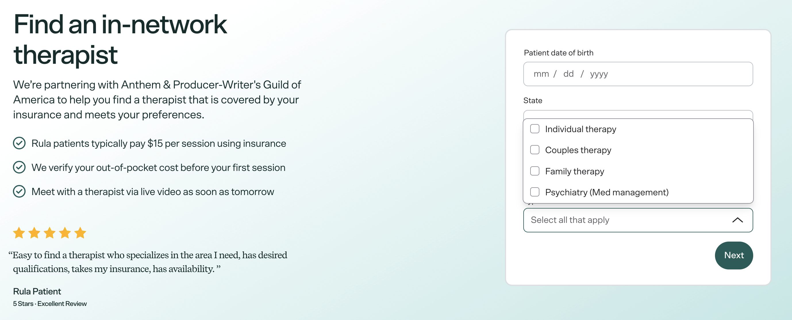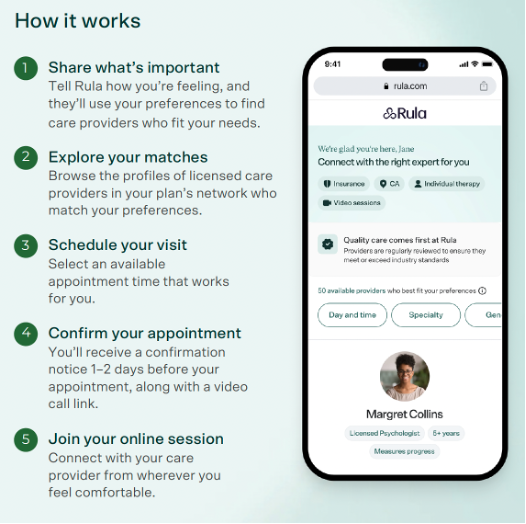 Rula connects you with licensed therapists and psychiatric providers, and appointments are often available within one day. You can let Rula know about your preferences and needs, and they will attempt to make a match. They offer both in-person and virtual sessions – at your discretion. If you’re currently seeing an out-of-network provider, Rula will help you to transition to in-network care without compromising quality or continuity.